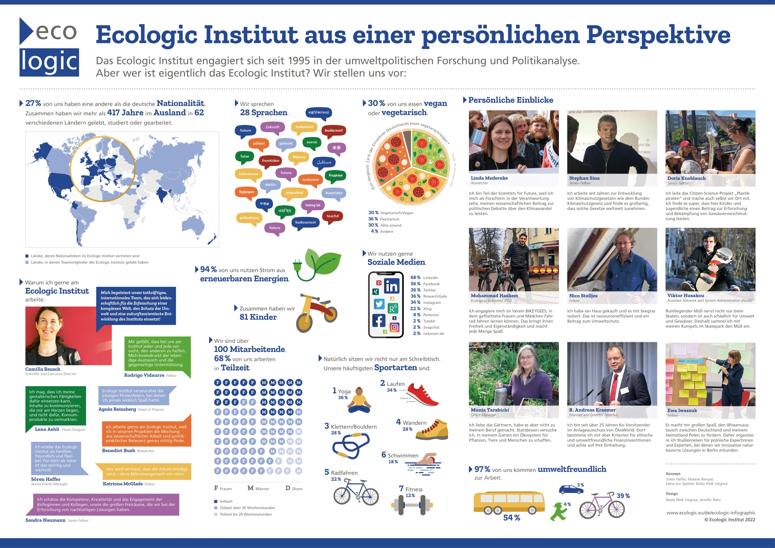 Unter den 100 Mitarbeitern aus mehr als 20 Ländern sind Geologen, Biologen, Politologen, Juristen und Soziologen mit breitem Know-How in Umweltthemen. Kunden sind zum Beispiel die Europäische Kommission und das EU-Parlament, deutsche Ministerien, Ämter und Behörden.