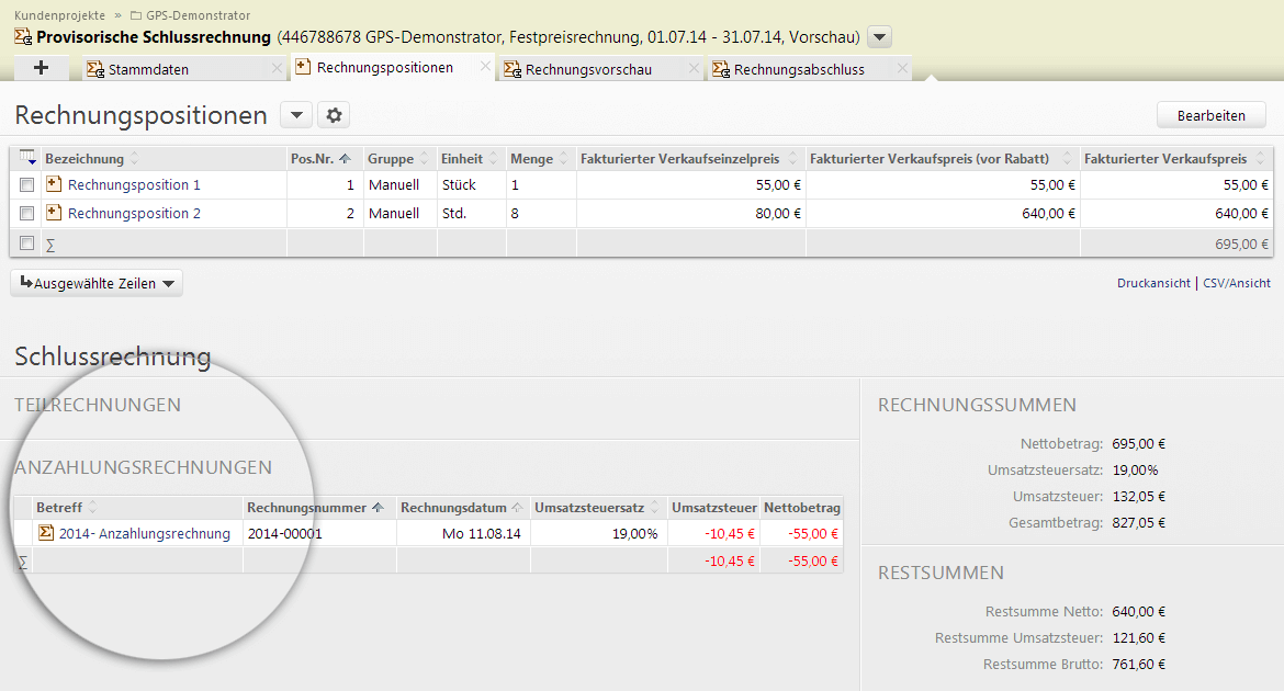 Beim Erstellen von Schlussrechnungen werden für die abgezogenen Anzahlungsrechnungen Rechnungspositionen erstellt. Diese Rechnungspositionen sind nicht Teil der Rechnungssumme und werden analog den Rechnungspositionen der Anzahlungsrechnungen als "nicht umsatzrelevant" markiert. Eine passende Schlussrechnung listet alle abrechenbaren Positionen und zieht die bereits gestellte Anzahlungsrechnung ab.