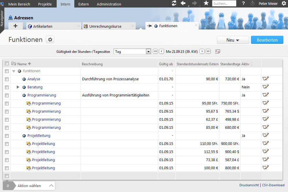 Ob zentral oder für einen Kunden: Einmal angelegt, werden die Funktionen wie eine Vorlage in Ihren Projekten wiederverwendet. Projektron BCS 7.26 berücksichtigt dann automatisch die Preise in der hinterlegten Projektwährung.