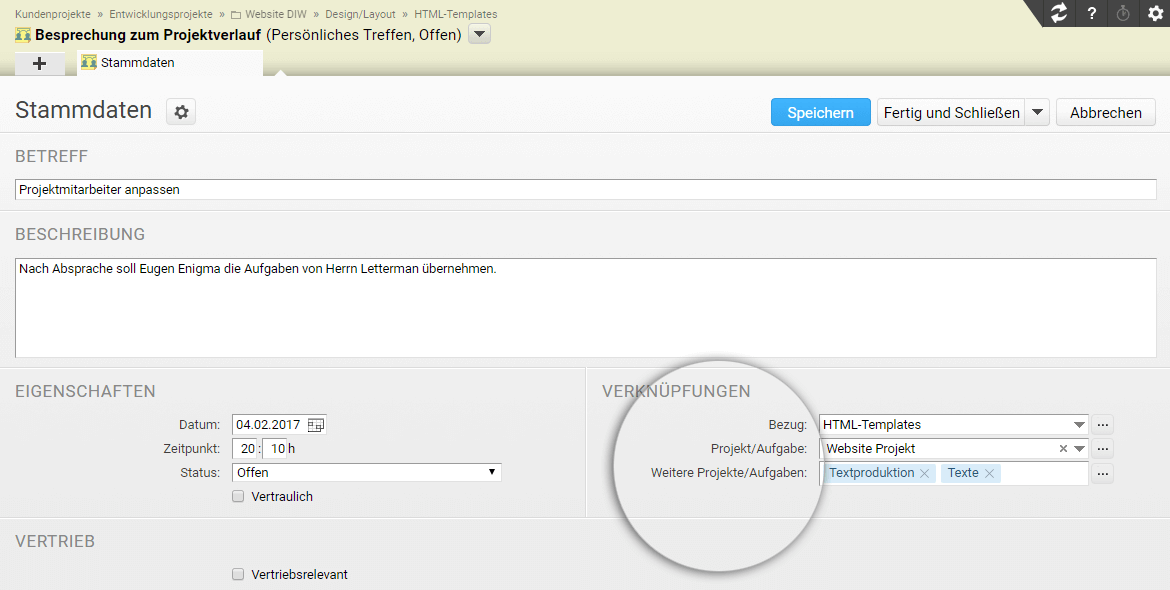 An Memos und eingegangenen E-Mails in der Kontakthistorie können Sie jetzt mehrfache Zuordnungen anlegen, falls diese sich nicht eindeutig zu einem Projekt oder einer Person zuordnen lassen. So haben Sie in allen beteiligten Projekten den Überblick über Ihre Kommunikation.