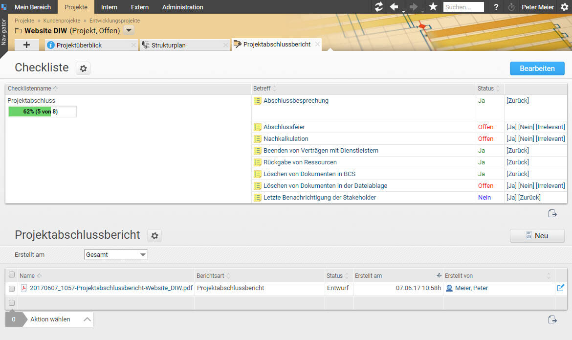 Die Projektmanagement Software Projektron BCS unterstützt den Projektleiter von Beginn des Projekts bis hin zum Abschluss. Die neue Ansicht Abschlussbericht findet man im Projekt und auch im Assistenten. In der Kategorie zum Projekt kann direkt eine Vorlage für die Checkliste für den Projektabschluss hinterlegt werden. Mithilfe der Checkliste wird der Projektleiter durch den Projektabschluss geführt. Zum Schluss kann der Projektabschlussbericht generiert und mit weiteren Dokumenten ergänzt werden.