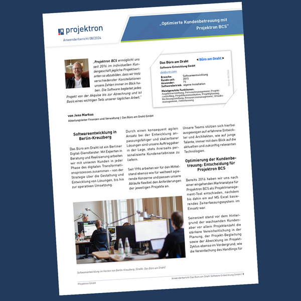 Seit 2016 setzt die Das Büro am Draht Software-Entwicklung GmbH auf Projektron BCS, um ihre vielfältigen Kundenprojekte erfolgreich zu steuern. In unserem Anwenderbericht zeigt Jens Markus, Abteilungsleiter Finanzen und Verwaltung, wie der Berliner Digital-Dienstleister durch eine funktional-iterative Softwareeinführung seine Prozesse optimiert und die Kundenbetreuung auf ein neues Niveau gehoben hat. Projektron BCS hat sich längst als zentrale Plattform von der Kundenakquise über die Zeiterfassung bis hin zur Abrechnung etabliert und dabei hilft tagtäglich, individuelle Lösungen für anspruchsvolle Kunden effizient umzusetzen.