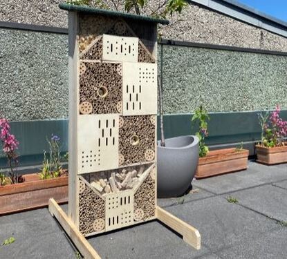 Ein großes Insektenhotel ziert fortan unsere Terrasse und lädt Wildbienen, Käfer, Schmetterlinge und Schwebfliegen zum nisten und überwintern ein.