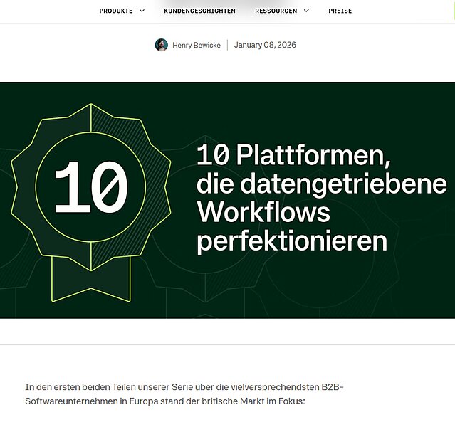 Screenshot des Moss-Magazinartikels „10 deutsche Plattformen, die alltägliche Prozesse in datengetriebene Workflows verwandeln“ mit Erwähnung von Projektron BCS als eine der vorgestellten Softwarelösungen (Quelle: https://www.getmoss.com/de-de/magazine/10-deutsche-plattformen-datenbasiert-steuern, aufgerufen am 13.01.2026).