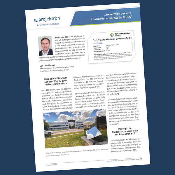 Das Carl-Thiem-Klinikum Cottbus ist zukünftiger Vorreiter der Digitalisierung im Gesundheitswesen. Die Zukunft der medizinischen Versorgung erfordert einen starken Fokus auf die Digitalisierung. Diese verändert notwendigerweise Prozesse und schafft neue Komplexität. Um all dies adäquat abbilden zu können, baut das Carl-Thiem-Klinikum auf Projektron BCS. Im Anwenderbericht zeigt Thilo Menges, Leiter der Abteilung Digitalisierung & Innovation des CTK, wie vielfältig BCS für verschiedene Projektarten im Gesundheitswesen einsetzbar ist und wie tiefgreifend Projektron BCS die Digitalisierung des Gesundheitssektors unterstützt.