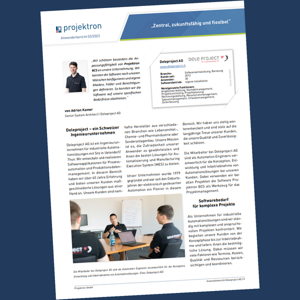 Bereits seit über 40 Jahren entwickelt und realisiert die Schweizer Deleproject AG maßgeschneiderte Softwareapplikationen für Prozessautomation und Produktionsdatenmanagement im Sonderanlagenbau sowie in der Lebensmittel-, Chemie- und Pharmaindustrie. Seit 10 Jahren setzt die Deleproject AG auf Projektron BCS, um das gesamte Projektmanagement von Angebotserstellung bis zur Fakturierung für ihre komplexen und anspruchsvollen Projekte abzubilden. Adrian Kamer, Senior System Architect, verrät im aktuellen Anwenderbericht, wie Projektron BCS die Arbeit bei Deleproject verändert hat, was er an BCS besonders schätzt und welche Pläne er für die Zukunft geschmiedet hat.