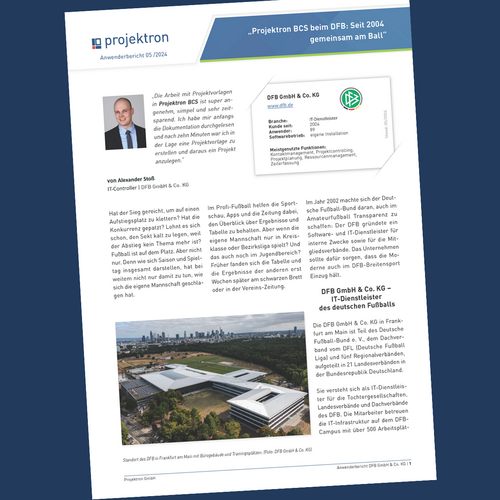 Projektron und der DFB: Seit 2004 gemeinsam am Ball für eine moderne Fußballlandschaft! Seit zwei Jahrzehnten unterstützt Projektron BCS den Deutschen Fußball-Bund dabei, effizienter und transparenter zu arbeiten. In unserem neuesten Anwenderbericht erfahren Sie, wie unsere webbasierte Projektmanagementlösung dem DFB hilft, von der Bundesliga bis zur Bezirksliga den Überblick zu behalten und den Fußball in eine digitale Zukunft zu führen. Alexander Stoß, IT-Administrator bei der DFB GmbH & Co. KG, gewährt spannende Einblicke in die tägliche Arbeit mit Projektron BCS.