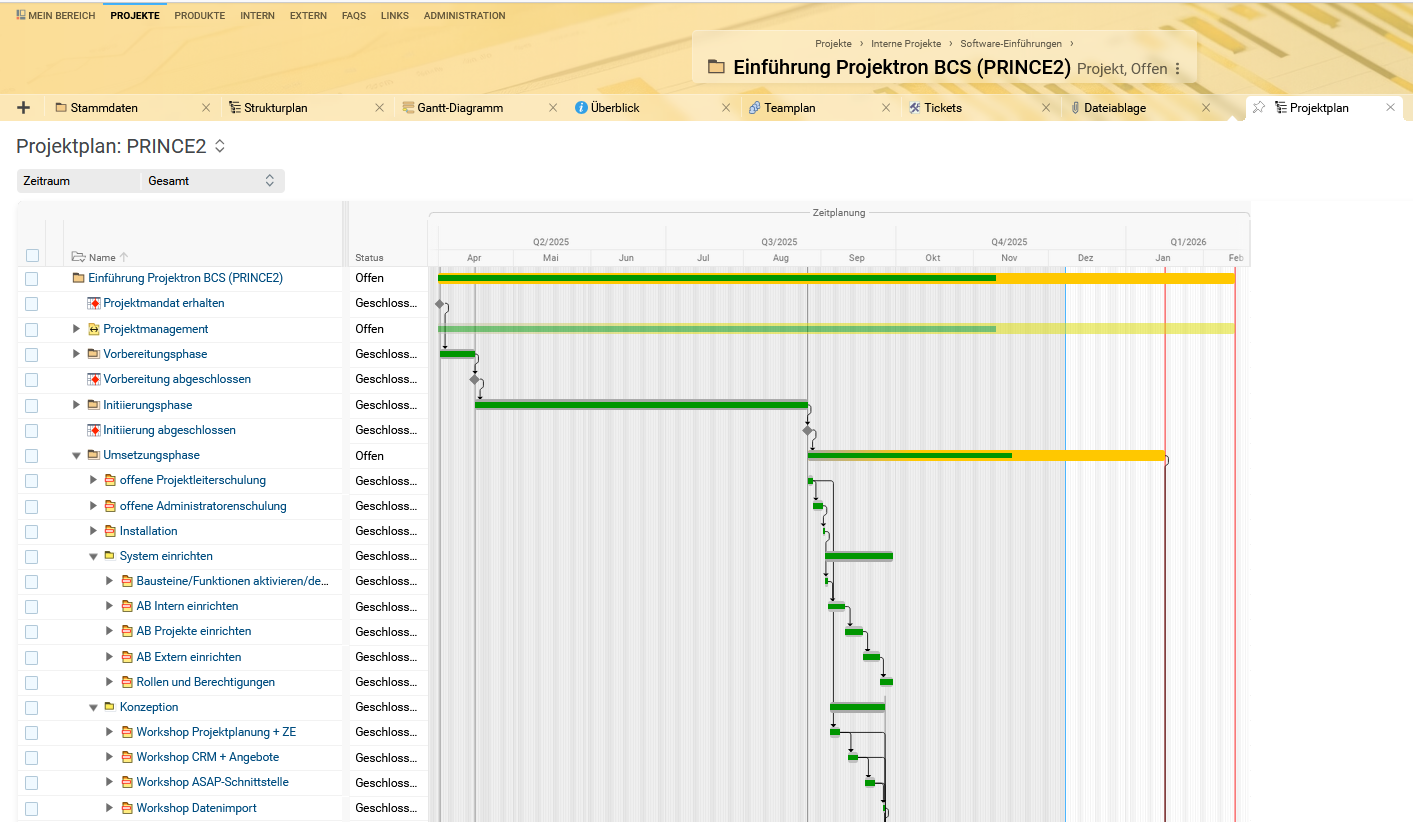 BCS unterstützt die PRINCE2-Methodik effektiv und praxisnah, indem es eine zentrale Plattform für die strukturierte Planung, Steuerung und Überwachung von Projekten bietet. Funktionen wie Phasenplanung, Risiko- und Qualitätsmanagement, klare Rollendefinitionen sowie eine umfassende Dokumentation ermöglichen eine nahtlose Integration der PRINCE2-Prinzipien in den Projektalltag.