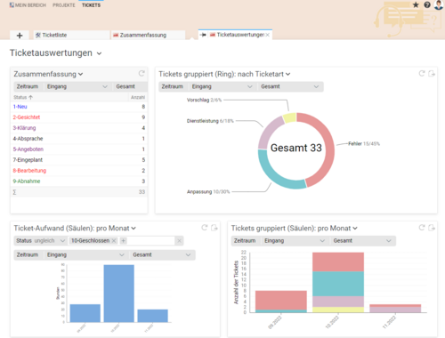 Mehr Transparenz für Kunden mit einer Kundenlizenz bietet das BCS-interne Ticketsystem ab Version 22.3: Die Ansicht "Ticketauswertungen" erlaubt es einem Kunden, die Daten für seine Projekte einzusehen. Daten aus anderen Projekten werden nicht dargestellt.