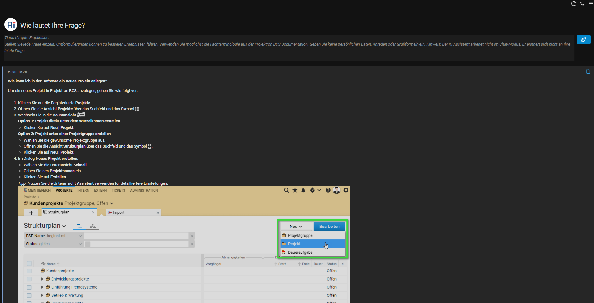 Ein Beispiel: Eine Frage wie „Wie lege ich ein neues Projekt im System an?“ würde ein Standardmodell mit einer allgemeinen Anleitung beantworten. Ein RAG-System hingegen durchsucht die tatsächliche Dokumentation und liefert eine konkrete Schritt-für-Schritt-Erklärung aus dem echten Anwendungskontext plus Screenshot.