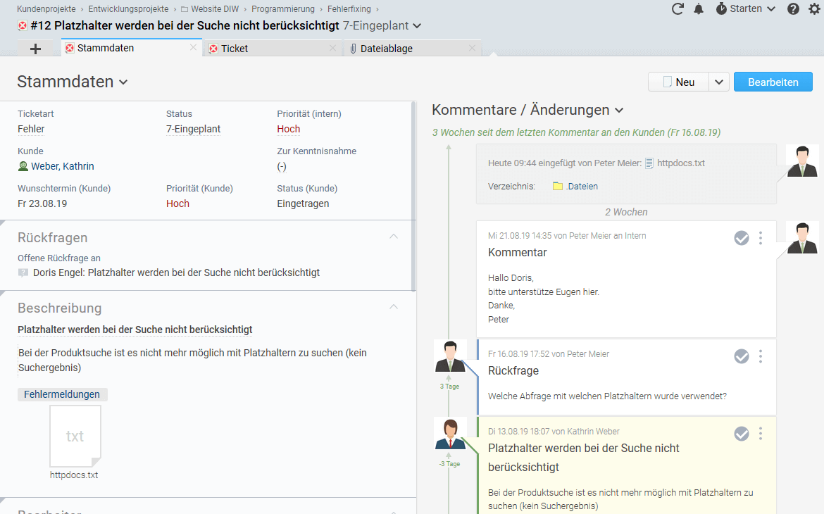 - Anhänge: Screenshots oder andere relevante Dateien hängt der Ersteller einfach per Drag-and-Drop ans Ticket an.