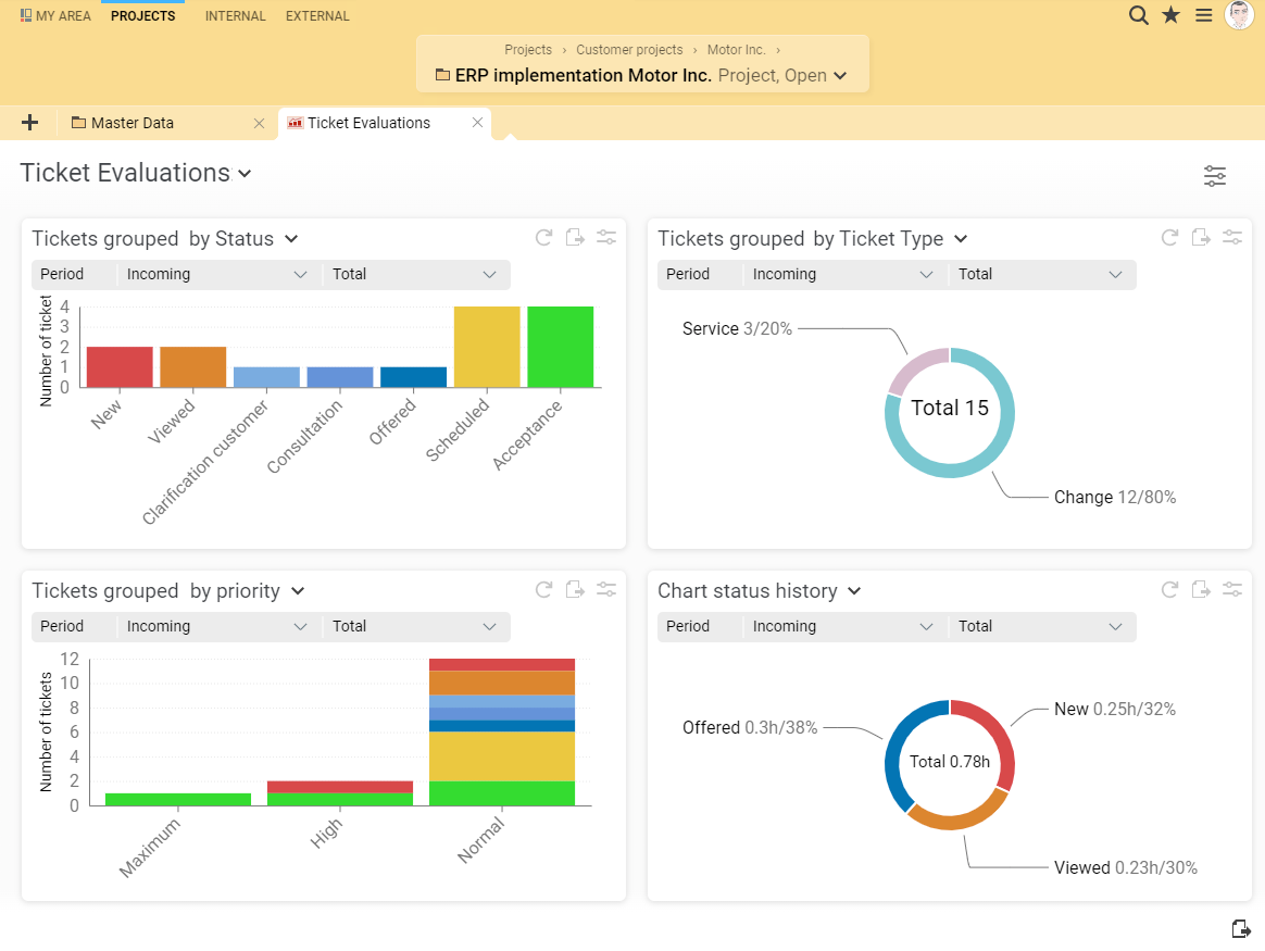 Projektron BCS supports you in checking your quality management measures with a wide range of evaluation options. If you use the ticket system from Projektron BCS, you can easily gain important information for your quality management - for example, about frequent product errors.