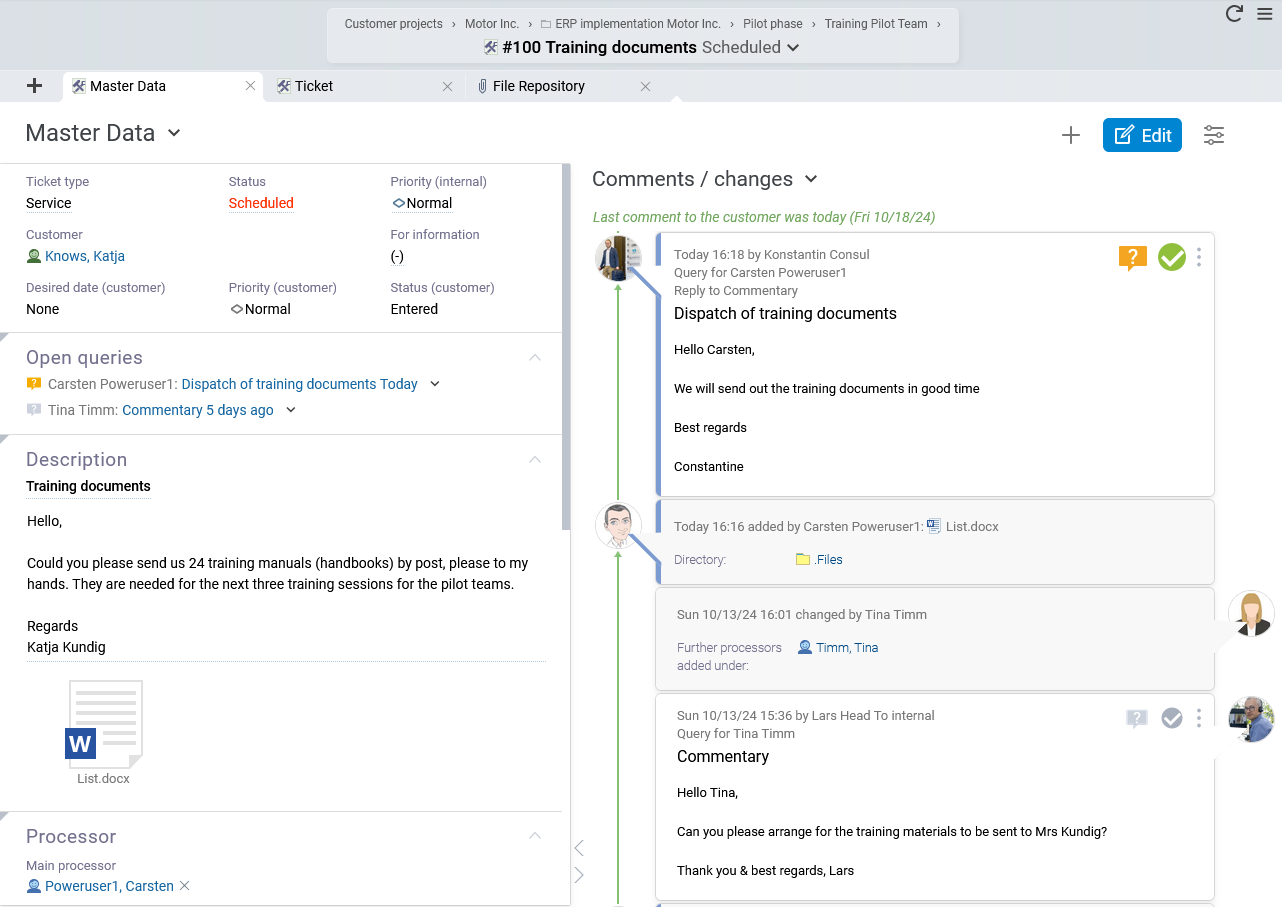 | Automation: The ticket system considerably simplifies routine tasks and the organization of inquiries once appropriate workflows have been defined. These include the recording of requests, transfer to a digitally standardized format, categorization, prioritization and initial evaluation. | |