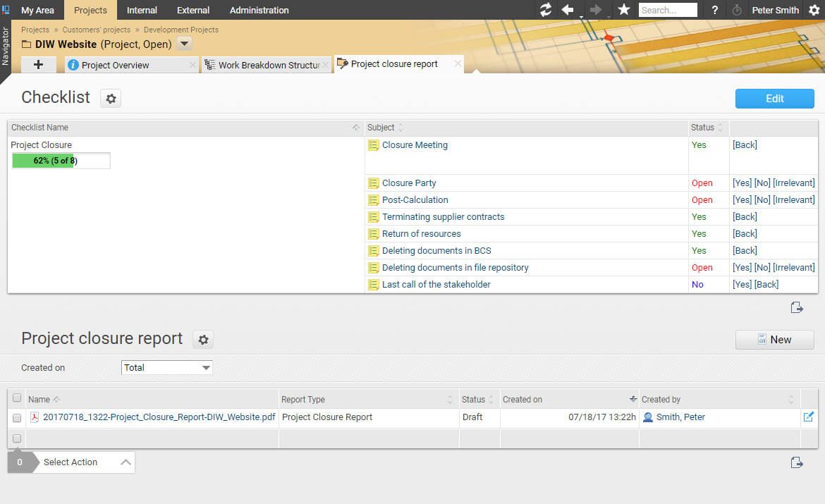 The Projektron BCS project management software supports the project manager from the start of the project to its completion. The new Final Report view can be found in the project and the wizard. You can save a template for the checklist for the project closure in the category related to the project. The checklist guides the project manager through the project closure. The project closure report can be generated and supplemented with additional documents.