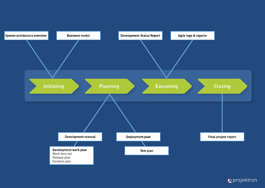 - Execution phase: Here, the development status report and various logs are used to document and communicate the state of development. Area-specific risks, problems, decisions and changes are recorded in project logs.