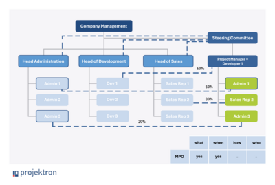 The project organization forms the hierarchical framework of a project, defines the vertical flow of information and the authority of the people involved. It determines who makes which decisions, from whom approval is obtained and to whom the decisions are forwarded. Thus, it describes the structure of formal power relations.
