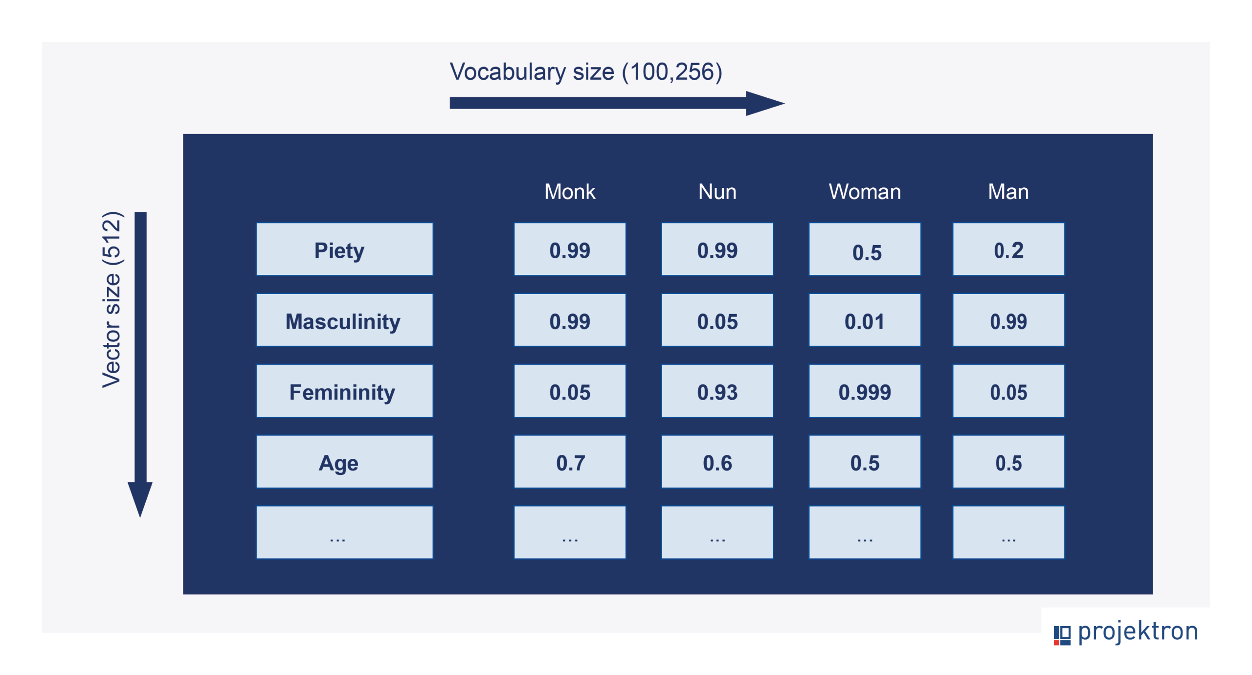 To get an initial idea of how to visualize such an “embedding,” let's travel back in time to the Middle Ages. The monastery library is to be vectorized. The monks have decided to capture the meaning of every word in their vocabulary (they know just over 100,000 words) by assigning a weighted score from 512 carefully chosen adjectives.
