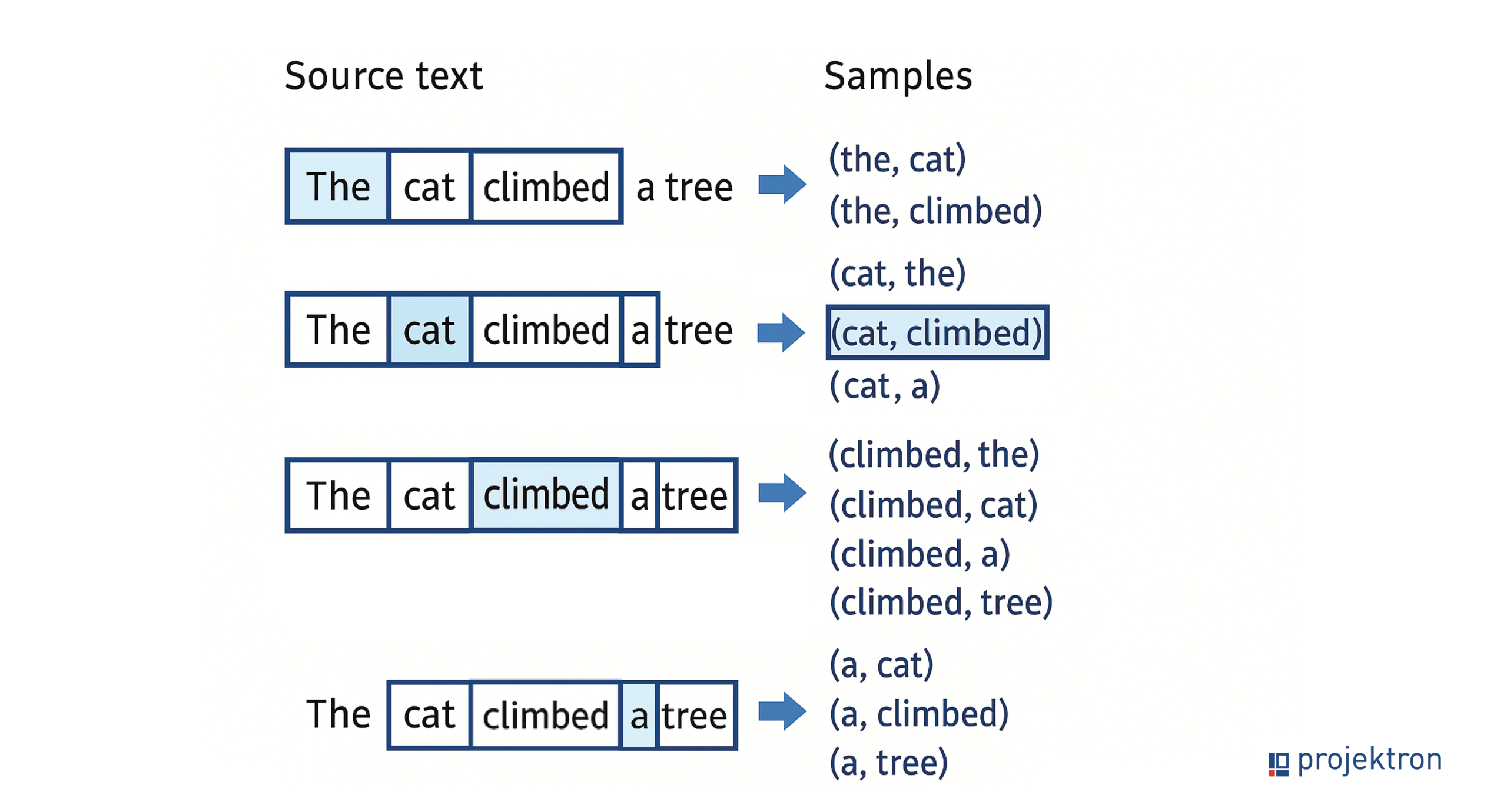 Now we need a collection of neighboring words as training data. The idea was to determine the vectors by analyzing neighboring words. Here is the beginning of a collection based on our text corpus: