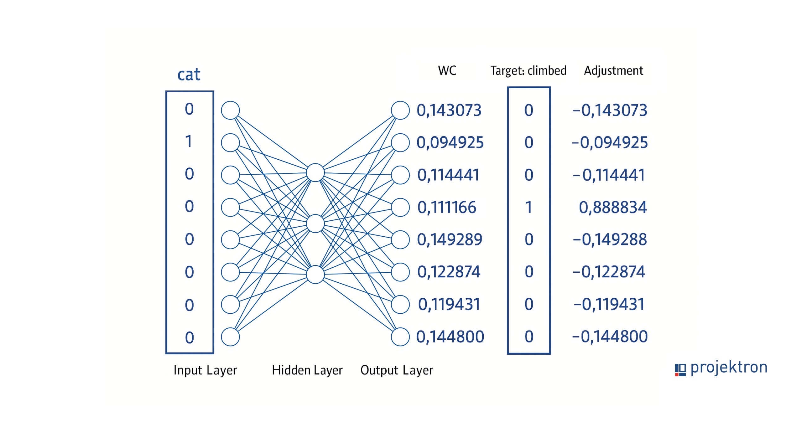 ![Visualization of neural network training: Left, the one-hot encoding of the input word „cat“, followed by input layer, hidden layer, and output layer. Then the weight coefficient (WC) is shown, the target word „climbed“ as a one-hot vector, and the adjustment column for backpropagation. [Translate to Englisch:] Illustration of neural network training: Input token „cat“ in one-hot encoding, three layers of the network (input layer, hidden layer, output layer), weight coefficient (WC), target word „climbed“ as one-hot vector, and column for weight adjustment in backpropagation.](/fileadmin/_processed_/7/e/csm_bcs-vektrorisierung-neuronales-netz-en_c75cd2977a.png)