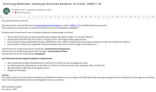 In addition, an email is generated as soon as a specific milestone is set to “Closed” status by the project manager in the structure plan. This email contains detailed instructions for the entire project team and informs them of the tasks that must be completed by a specified deadline. This ensures that the entire project team knows exactly who has to do what and when in order to efficiently implement the next steps.