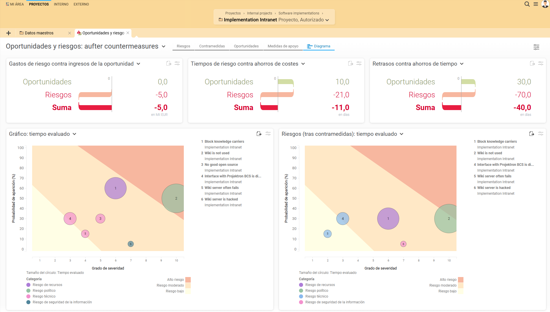 El principio de gestión activa de riesgos (Risk) se apoya en BCS con funciones de registro de riesgos, matriz de riesgos y seguimiento de medidas, integradas directamente en el contexto del proyecto.