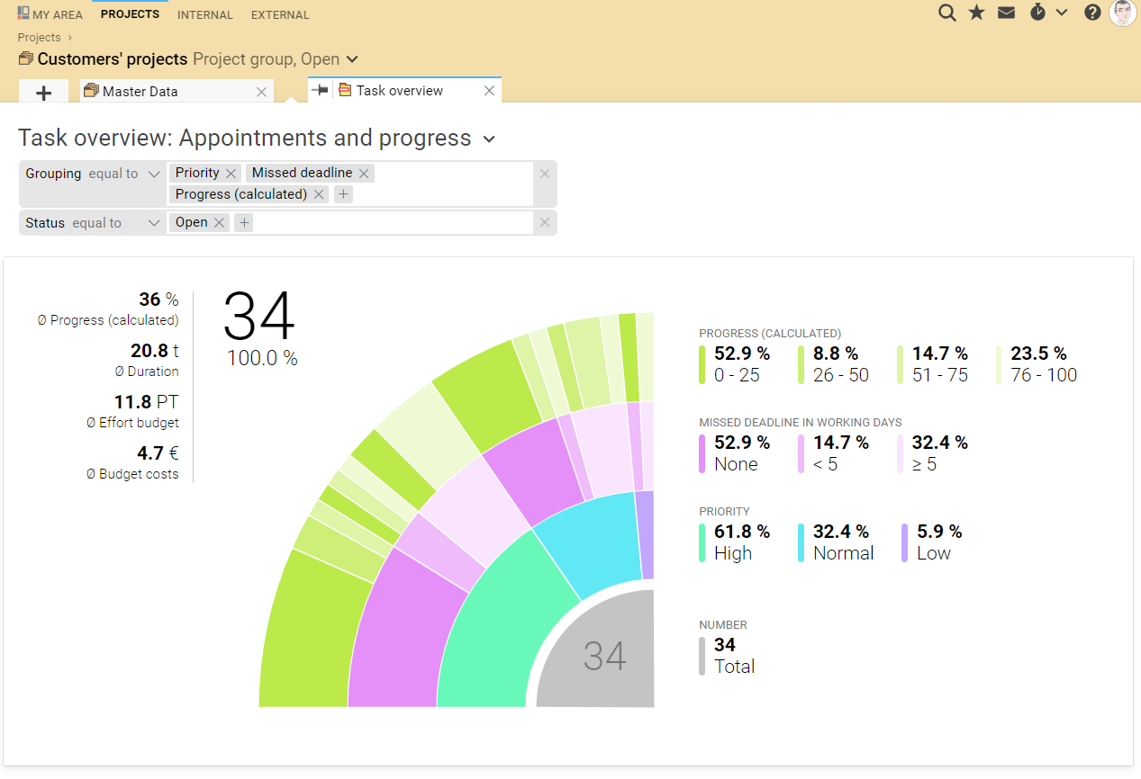 Si los proyectos de su organización constan de un gran número de tareas, no siempre es fácil registrar de un vistazo el progreso técnico de las tareas a lo largo de todo el proyecto. Para poder registrar el progreso del proyecto en varias dimensiones de forma simultánea y clara y evaluarlo con respecto a varios ratios, Projektron BCS ofrece un diagrama de sunburst de tareas como gráfico interactivo con las correspondientes opciones de agrupación.