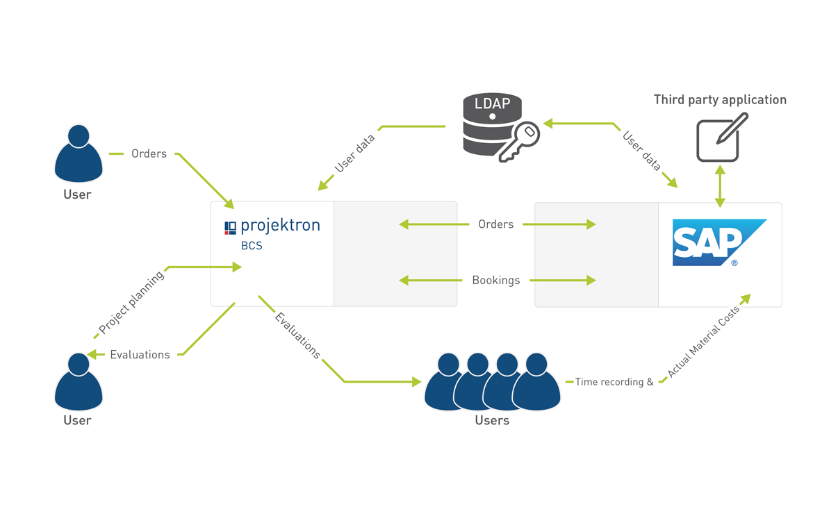 Un autre exemple pratique est présenté dans le graphique ci-dessus. Ici, les projets et les commandes sont gérés dans BCS. Grâce à l'exportation des commandes et des données de projet associées, des objets PSP sont créés dans SAP et les valeurs des commandes sont enregistrées comme budget prévisionnel sur les objets PSP. La saisie des temps et l'enregistrement des coûts matériels réels sont effectués dans SAP et importés par BCS, ce qui permet une évaluation complète.