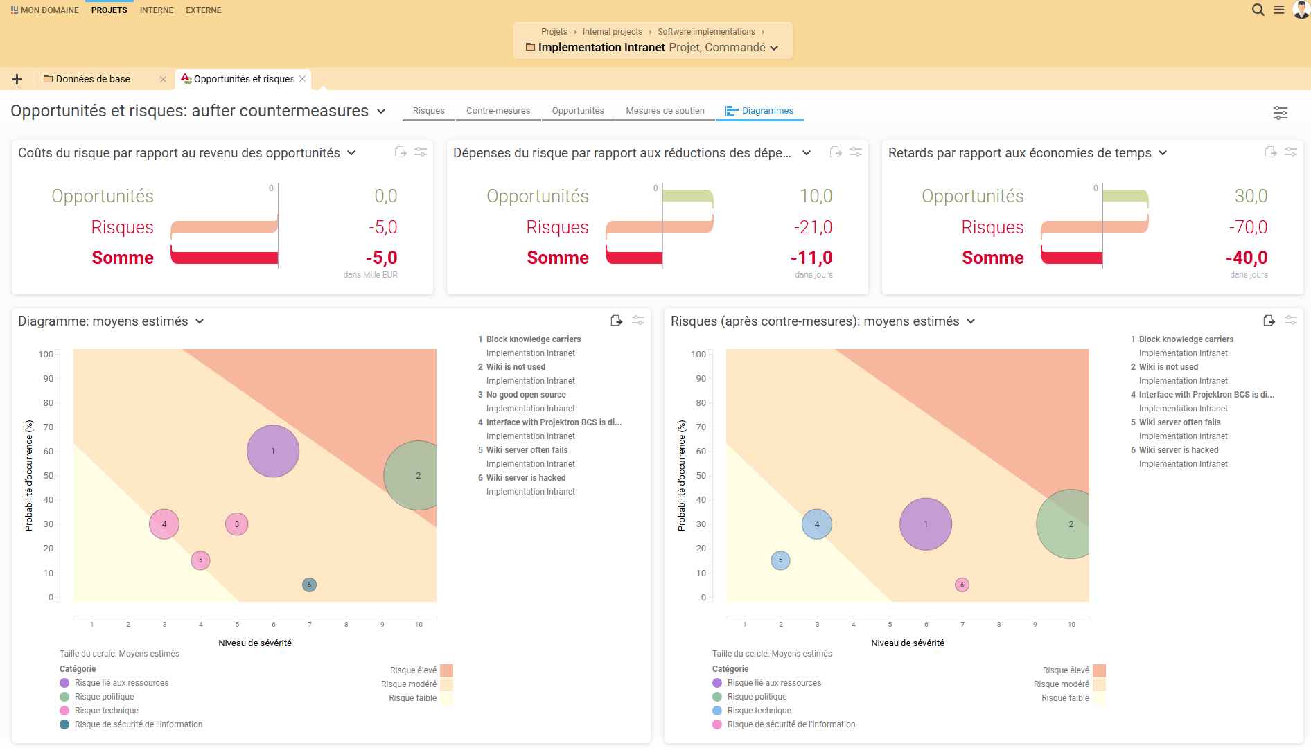 Le principe de gestion active des risques (Risk) est pris en charge dans BCS par des fonctions de saisie des risques, de matrice des risques et de suivi des mesures, directement intégrées dans le contexte du projet.