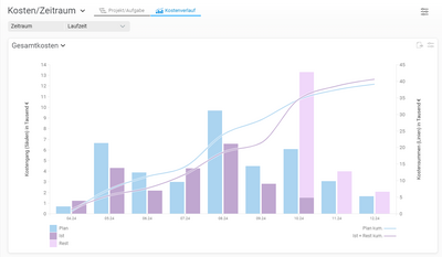 Ob klassische Kostenrechnung mit Kostenarten, Kostenträgern und Kostenstellen oder Auswertungen entlang der Projektstruktur: In Projektron BCS werten Sie genau die Kennzahlen in den Dimensionen aus, auf die es Ihnen ankommt, zum Beispiel die Planwerte gegen die Ist-Werte der Kosten und des Umsatzes. In einem übersichtlichen Diagramm werden Kostengang und Kostensummenlinie zusammengefasst und Sie betrachten so die Plan- und Ist-Werte Ihrer Kosten im zeitlichen Verlauf.