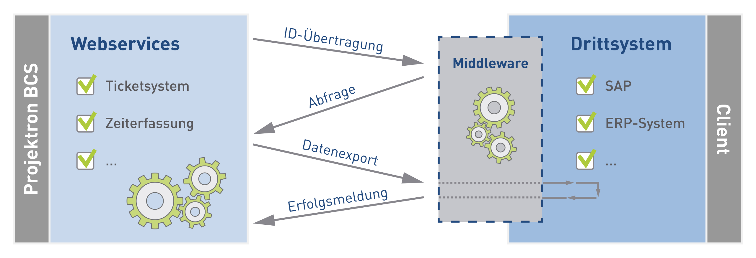 BCS übernimmt die Rolle des Servers. Das Fremdsystem agiert als Client, der die Webservices von BCS anspricht. Über diese Webservices kann der Client Daten in BCS abfragen, anlegen, ändern und löschen.