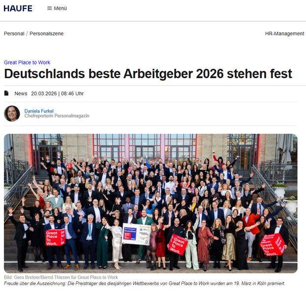 20.03.2026, Daniela Furkel, Chefreporterin Personalmagazin - Im aktuellen Ranking des Great Place to Work Deutschland wurden erneut die besten Arbeitgeber des Landes ausgezeichnet. Insgesamt 1.141 Unternehmen stellten sich dem umfassenden Prüfverfahren – so viele wie nie zuvor. Nach einer detaillierten Analyse von Arbeitsplatzkultur, Führung und Mitarbeiterzufriedenheit wurden schließlich 100 Unternehmen prämiert, die sich durch besonders hohe Werte bei Vertrauen, Engagement und Mitarbeiterbindung auszeichnen.
