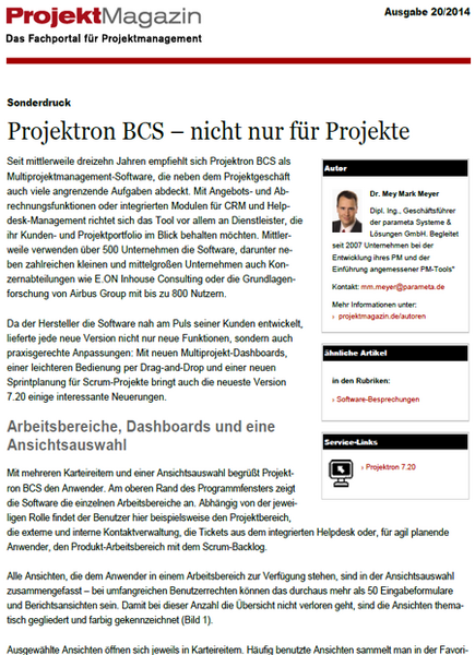 Projektron BCS bietet viele Funktionen, die weit über die anspruchsvolle Multiprojektplanung hinausgehen. […] Insgesamt empfiehlt sich Projektron BCS als kaufmännisch orientiertes Multiprojektmanagement-Werkzeug mit hilfreichen Funktionen für den Projekt-Alltag.