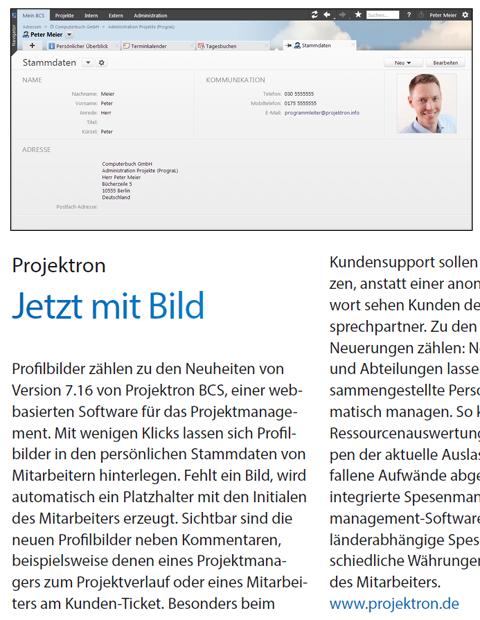 Profilbilder zählen zu den Neuheiten von Version 7.16 von Projektron BCS, einer webbasierten Software für das Projektmanagement. Mit wenigen Klicks lassen sich Profilbilder in den persönlichen Stammdaten von Mitarbeitern hinterlegen.